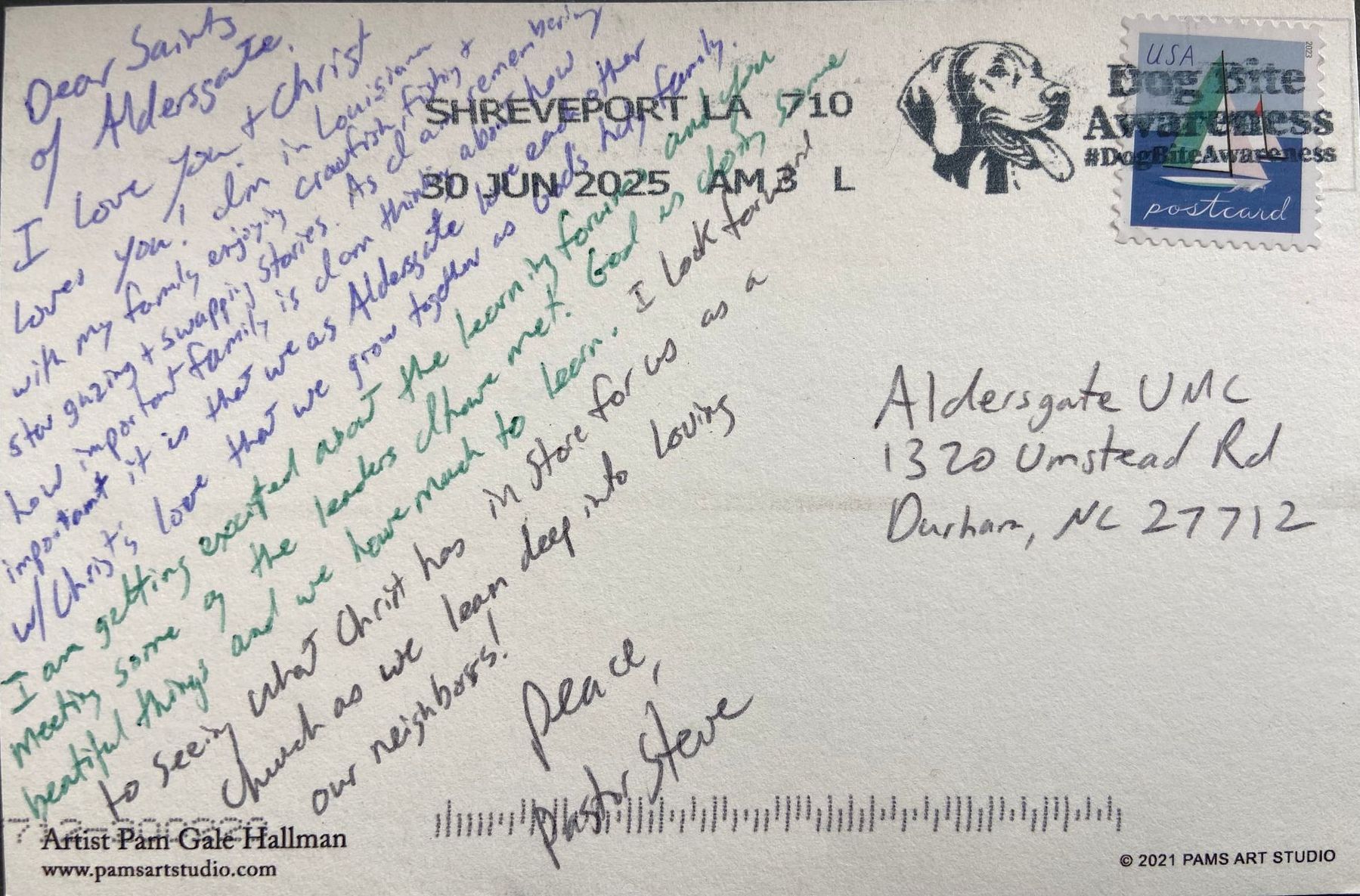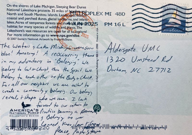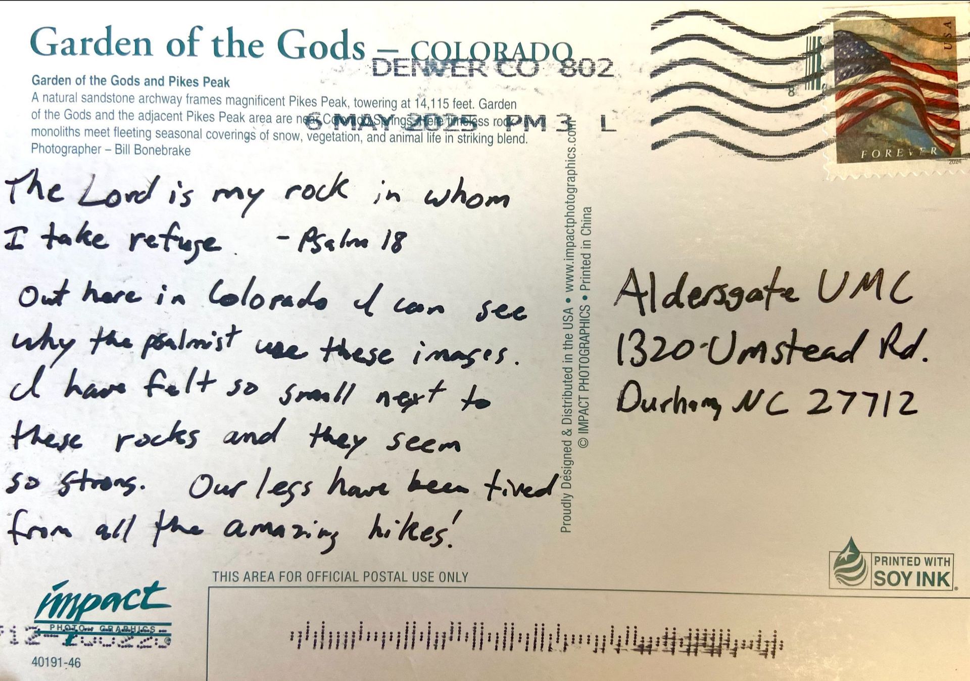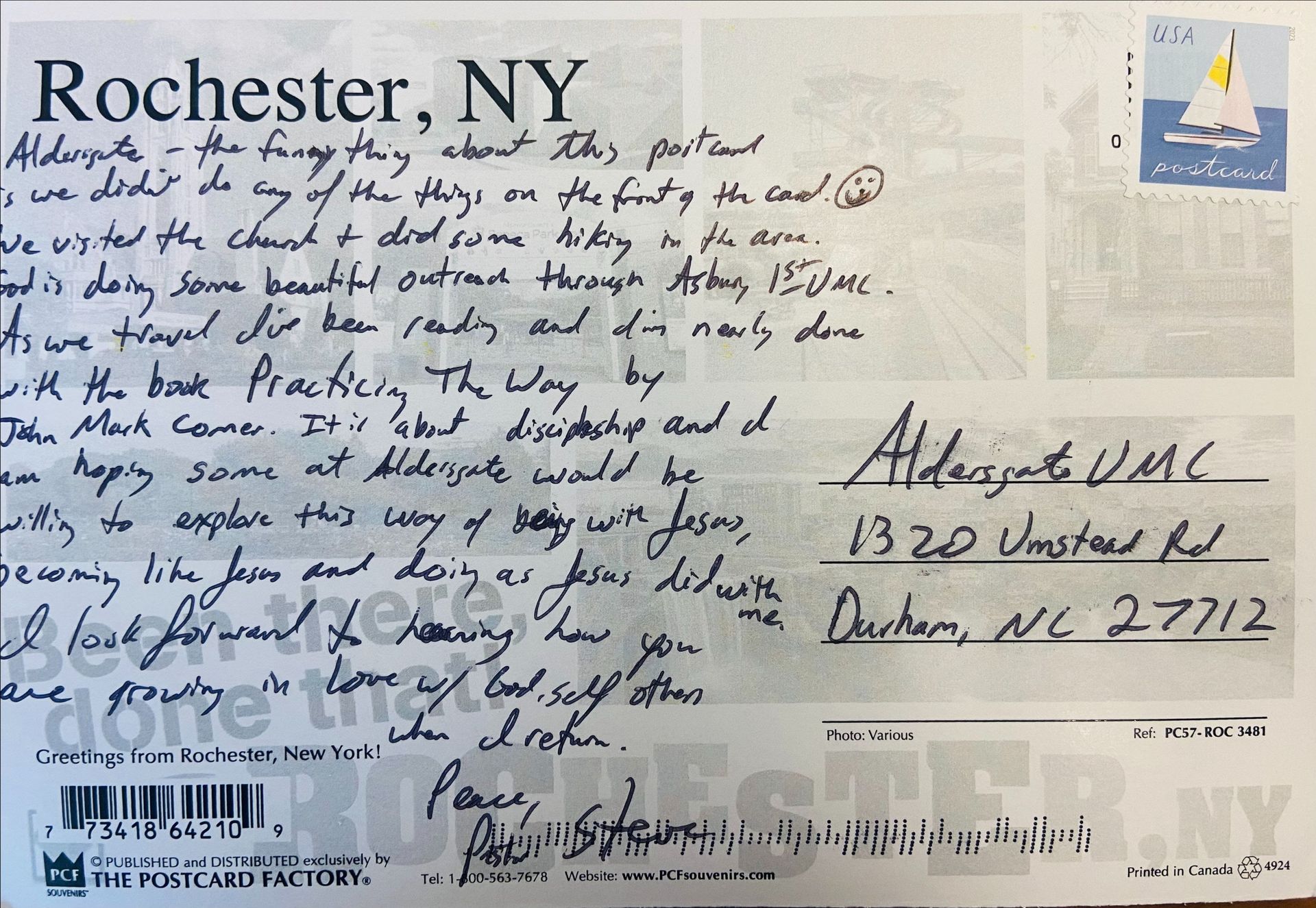 “Aldersgate—the funny thing about this postcard is we didn’t do any of the things on the front of the card. :) We visited the church + did some hiking in the area. God is doing some beautiful outreach through Asbury 1st UMC. As we travel I’ve been reading and I’m nearly done with the book Practicing the Way by John Mark Comer. It is about discipleship and I am hoping some at Aldersgate would be willing to explore this way of being with Jesus, becoming like Jesus and doing as Jesus did with me. I look forward to hearing how you are growing in love w/ God, self + others when I return. Peace, Pastor Steve”