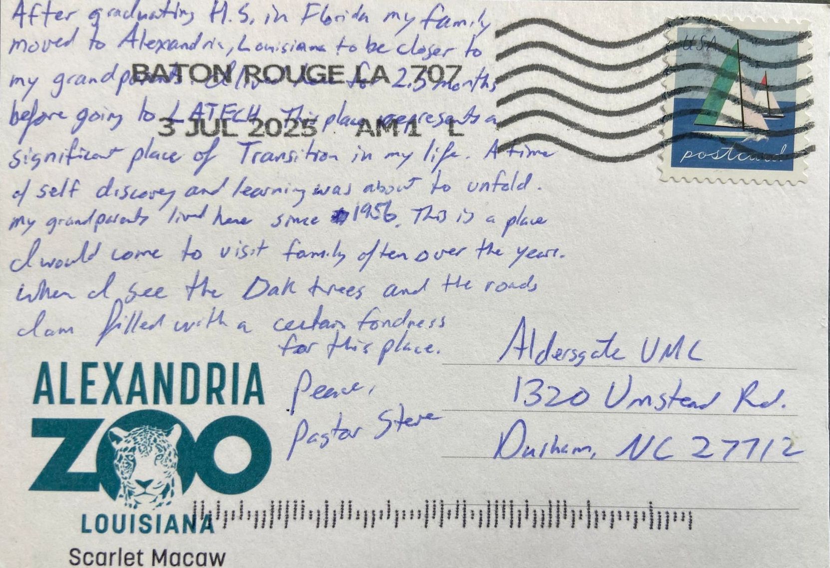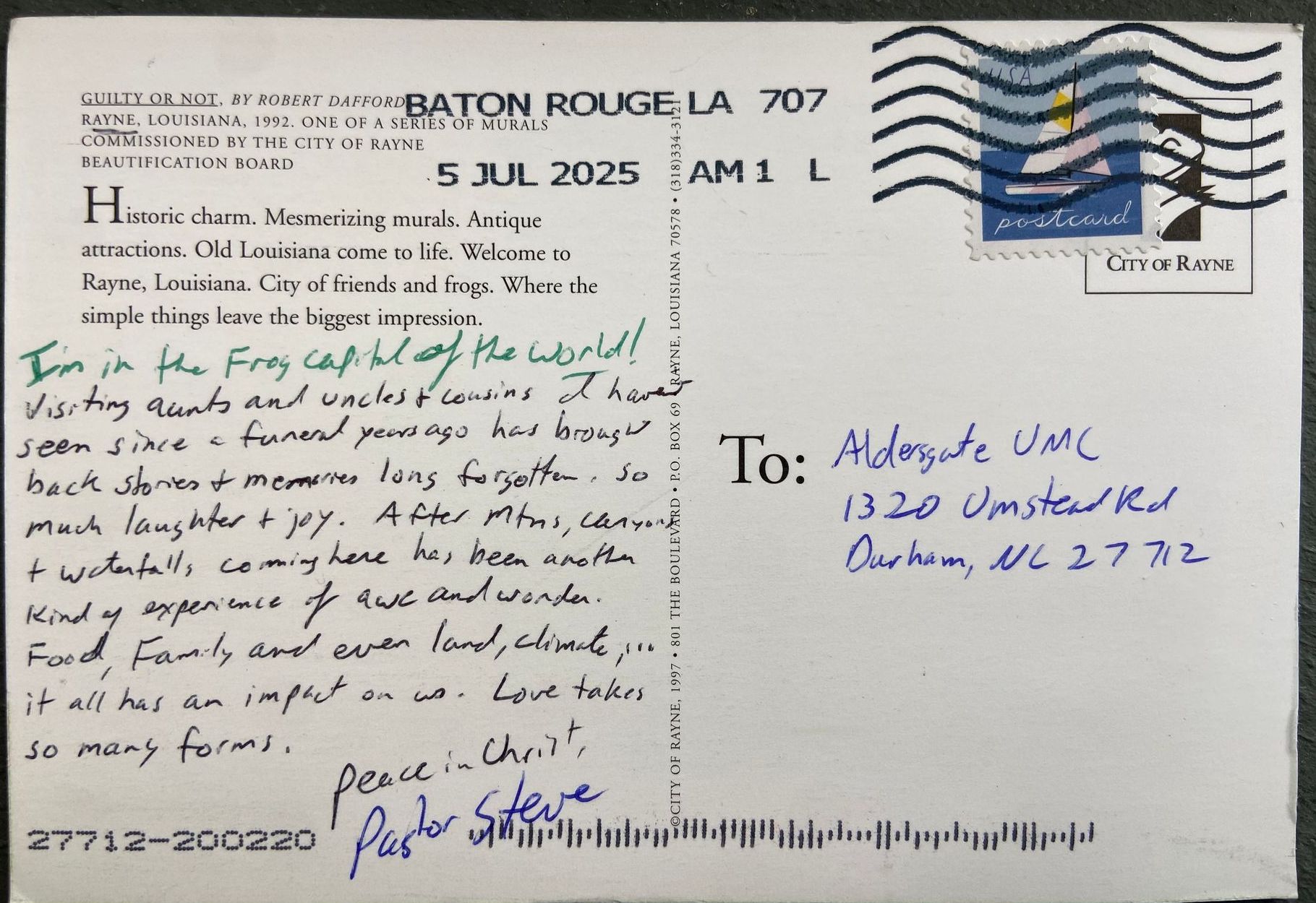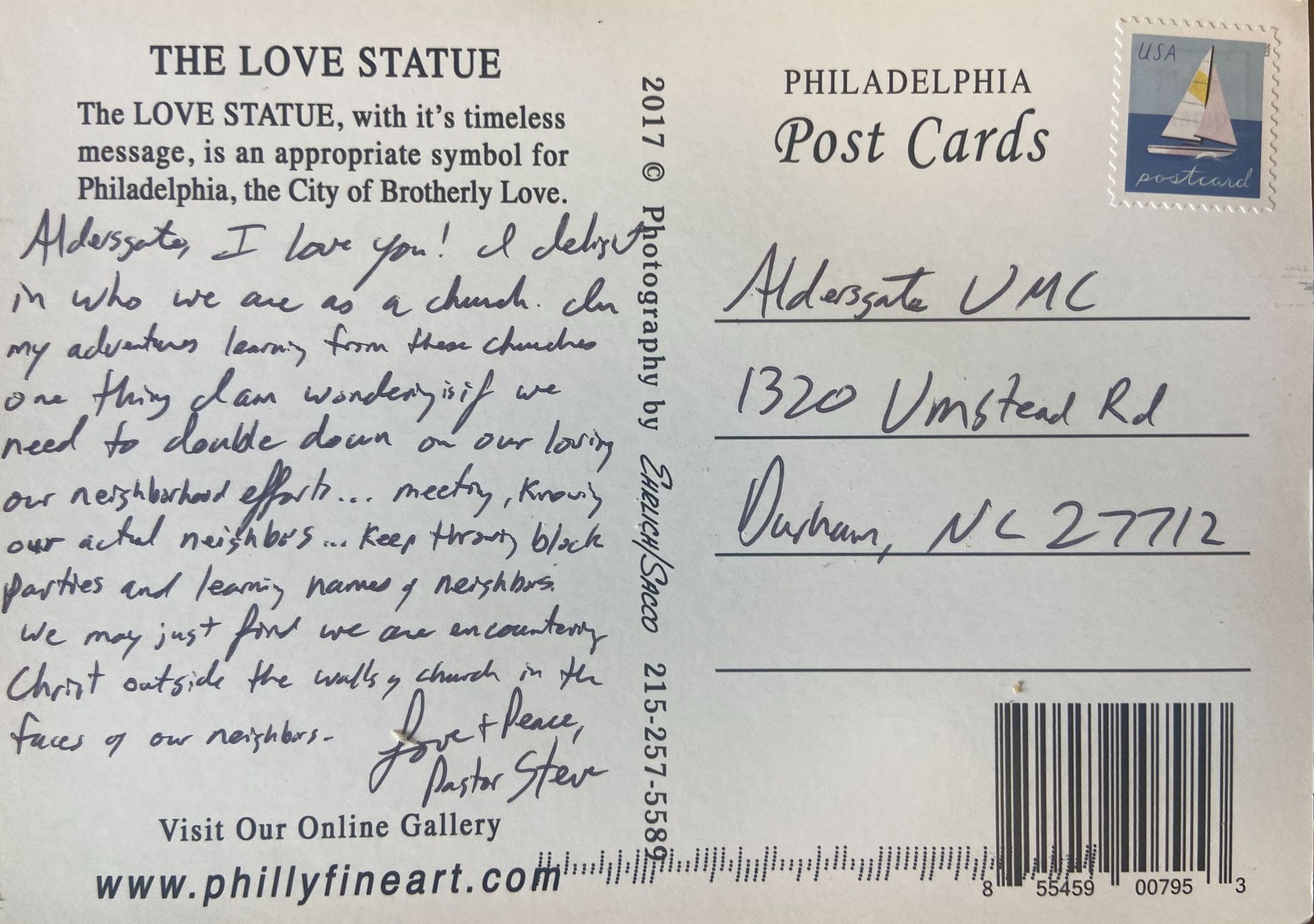 “Aldersgate—the funny thing about this postcard is we didn’t do any of the things on the front of the card. :) We visited the church + did some hiking in the area. God is doing some beautiful outreach through Asbury 1st UMC. As we travel I’ve been reading and I’m nearly done with the book Practicing the Way by John Mark Comer. It is about discipleship and I am hoping some at Aldersgate would be willing to explore this way of being with Jesus, becoming like Jesus and doing as Jesus did with me. I look forward to hearing how you are growing in love w/ God, self + others when I return. Peace, Pastor Steve”
