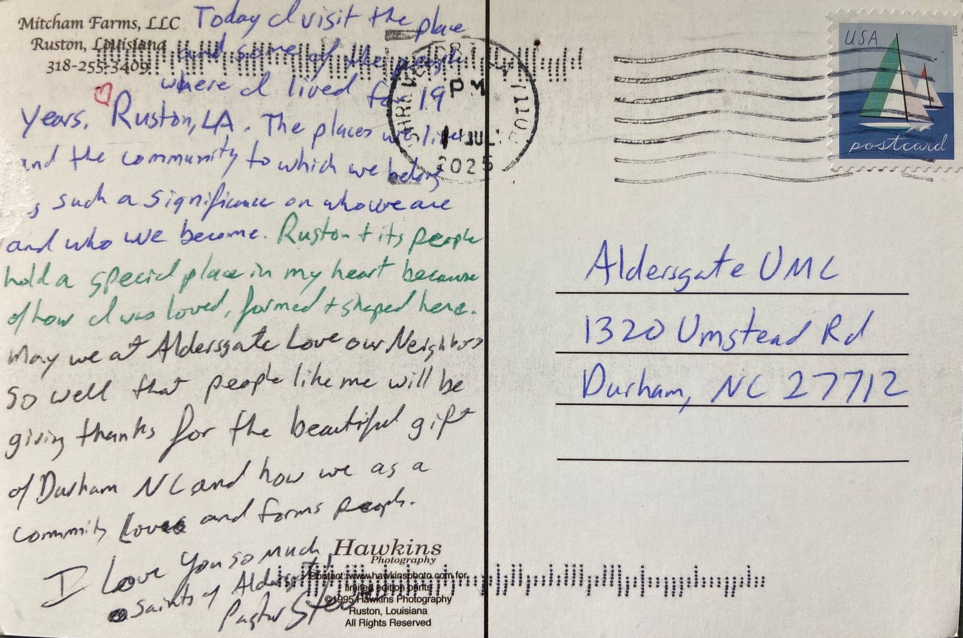 “Today I visit the place and some of the people where I lived for 19 years. Ruston, LA. The places we live and the community to which we belong have such a significance on who we are and who we become. Ruston + its people hold a special place in my heart because of how I was loved, formed + shaped here. May we at Aldersgate Love our Neighbors so well that people like me will be giving thanks for the beautiful gift of Durham NC and how we as a community love and form people. I love you so much, Saints of Aldersgate! Pastor Steve”