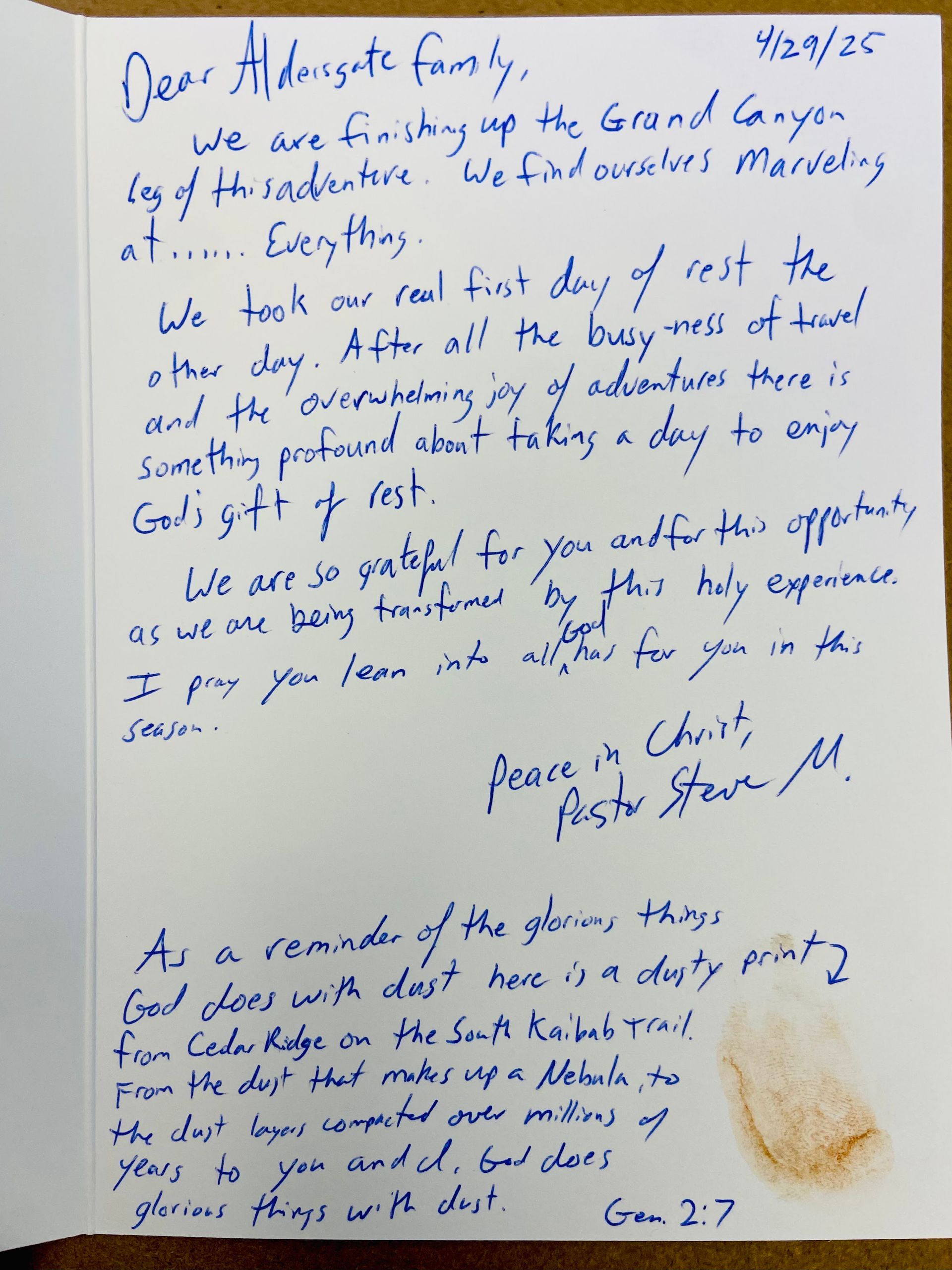 “4/29/25. Dear Aldersgate family, We are finishing up the Grand Canyon leg of this adventure. We find ourselves marveling at…Everything. We took our real first day of rest the other day. After all the busyness of travel and the overwhelming joy of adventures there is something profound about taking a day to enjoy God’s gift of rest. We are so grateful for you and for this opportunity as we are being transformed by this holy experience. I pray you lean into all God has for you in this season.